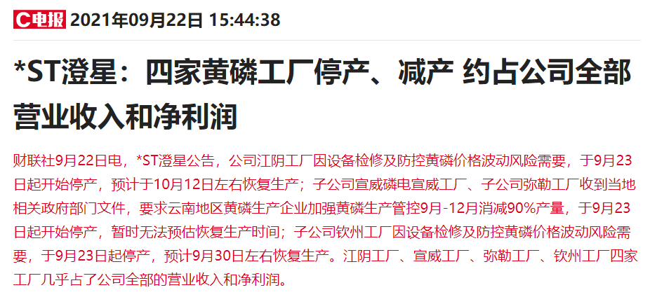 能耗管控下,上游原材料的“有价无量”情况还在加剧。今日盘后,国内仅有的几家生产黄磷的上市公司之一*ST澄星公告,旗下四家黄磷工厂全部停产、减产。