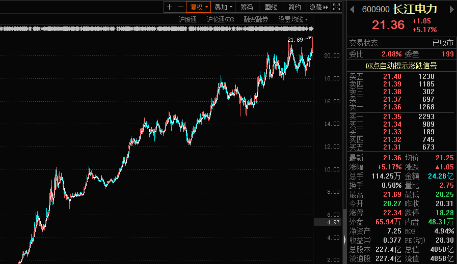 财联社9月22日讯,中秋假日期间的外盘重挫后,今日沪指低开,两市个股跌多涨少,但电力板块狂掀涨停潮。全球最大水电公司长江电力大涨5%,市值触及新高,达到近5000亿,力压一众消费大蓝筹;“巨无霸”次新股2000亿市值三峡能源连收两个涨停板,距上市以来市值高点相差不远。