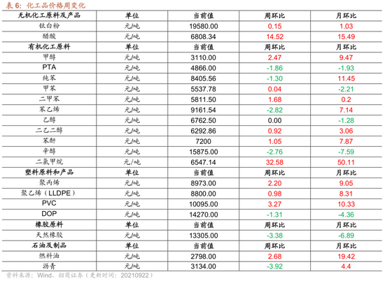 有机化工品期货价格涨跌互现, PVC、燃料油、聚丙烯等涨幅靠前,天然橡胶、沥青、苯乙烯等跌幅较大。截至9月22日,二氯甲烷价格周环比上涨32.58%至6547.14元/吨;PVC期货结算价上行3.27%至10095.0元/吨;燃料油期货结算价为2798.0元/吨,较上周上行2.68%;聚丙烯期货结算价为8973.0元/吨,较上周上行2.2%;LLDPE期货结算价为8800.0元/吨,较上周上行0.98%;二甲苯价格5811.5元/吨,较上周上行1.68%;二乙二醇期货结算价为6292.86元/吨,较上周上行0.92%;甲醇期货结算价3110.0元/吨,较上周上行2.47%;PTA期货结算价为4866.0元/吨,较上周下行1.86%;DOP期货结算价14270元/吨,较上周下降1.31%;天然橡胶期货结算价下行3.38%至13305.0元/吨;苯乙烯价格较上周下降2.82%至9161.54元/吨;辛醇价格较上周下降2.76%至15875元/吨;沥青结算价下行3.92%至3134.0元/吨。