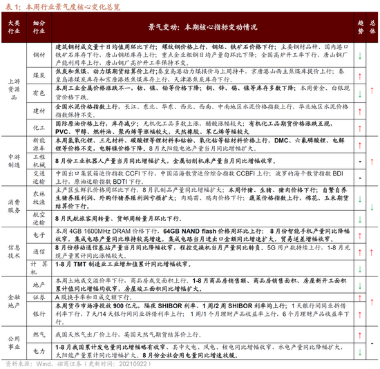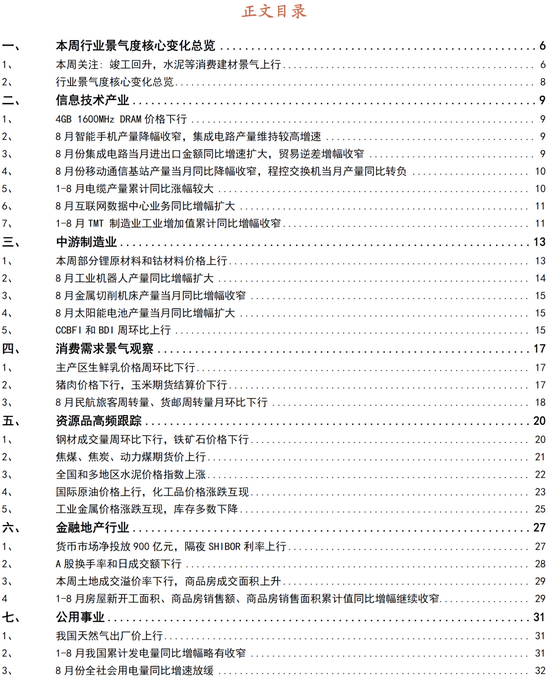 TMT方面,8月份智能手机产量同比降幅收窄,集成电路产量同比维持较高增速。8月份移动通信基站产量当月同比降幅收窄,程控交换机当月产量同比转负。中游制造方面,本周部分锂原材料和钴材料价格上行;8月份工业机器人产量当月同比增幅扩大,金属切削机床产量当月同比增幅收窄。消费需求方面,仔猪、生猪、猪肉价格下行。资源品方面,建筑钢材成交量十日均值周环比下行;螺纹钢价格上行,钢坯、铁矿石价格下行;焦炭、焦煤、动力煤期货结算价上行;国际原油价格上行,库存减少;无机化工品多数上涨,醋酸涨幅较大;有机化工品期货价格涨跌互现,PVC、甲醇、燃料油、聚丙烯等涨幅较大,天然橡胶、苯乙烯等幅较大;锡、铝、锌等有色金属价格上行,黄金、白银现货价格下降。金融地产方面,隔夜SHIBOR利率上升,1-8月房屋竣工面积同比增幅扩大。