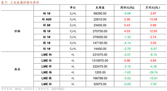 本周工业金属价格涨跌不一,锡和铝价格涨幅靠前,镍、铅价跌幅较明显;库存多数下降。截至9月22日,锡价格周环比上行4.03%至270750.0元/吨;铝价格周环比上行2.56%至22810.0元/吨;钴价格周环比下行1.32%至375000.0元/吨;铜平均价收于69290.0元/吨,周环比下行0.66%;长江有色市场锌价格为23400.0元/吨,周环比上行0.43%;铅价格14400.0元/吨,周环比下行2.70%;长江有色金属镍价格周环比下行4.14%至147150.0元/吨。