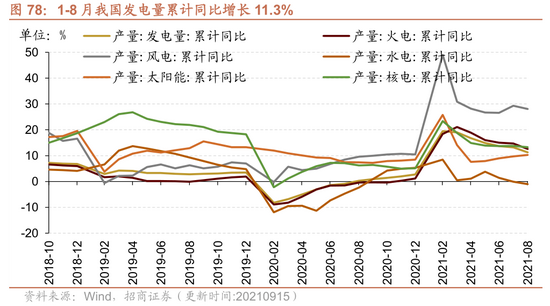 1-8月我国累计发电量同比增幅略有收窄,其中火电、风电、核电同比增幅收窄,水电产量同比降幅扩大,太阳能产量累计同比增幅扩大。1-8月份,我国累计发电量53894.0亿千瓦时,累计同比增长11.3%,增幅收窄1.9个百分点;其中火电累计产量38723.0亿千瓦时,同比增长12.6%;水电累计产量7617.1亿千瓦时,累计同比降低1%;风电累计产量3650.8亿千瓦时,累计同比上升28.1%;太阳能产量累计1204.29亿千瓦时,同比上升10.3%;核电产量累计2698.5亿千瓦时,同比上升13.3%