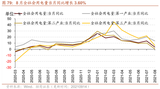 8月份全社会用电量同比增速放缓。8月份全社会用电量当月值7607.0亿千瓦时,当月同比增长3.6%,增速较上个月降低10.08个百分点。细分产业来看,第一产业当月用电量107.0亿千瓦时,同比增长13.7%;第二产业当月用电量4851.0亿千瓦时,同比增长0.6%;第三产业当月用电量1400.0亿千瓦时,同比增长6.2%,增速较上个月降低15.93个百分点。