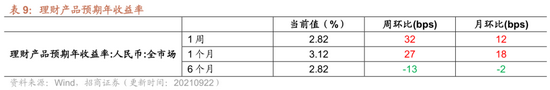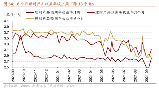 1周/1个月理财产品收益率上行,6个月理财产品收益率下行。截至9月19日,1周理财产品预期收益率为2.82%,较上周上涨32bps;1个月理财产品预期收益率为3.12%,较上周上涨27bps;6个月理财产品预期收益率为2.82%,较上周下行13个bps。