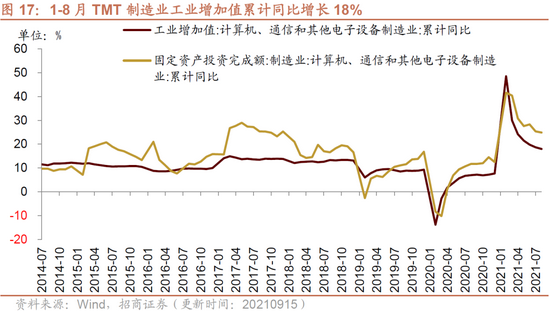 1-8月TMT 制造业工业增加值累计同比增幅收窄。1-8月份计算机、通信和其他电子设备制造业工业增加值累计同比为18%,相比1-7月份增幅收窄0.7个百分点;计算机、通信和其他电子设备制造业固定资产投资完成额累计同比为24.9%,相比1-7月份增幅收窄0.5个百分点。