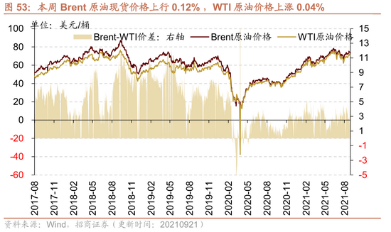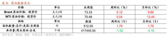 国际原油价格小幅上行,库存持续减少。截至2021年9月21日,Brent原油现货价格周环比上升0.12%至73.33美元/桶,WTI原油价格上升0.04%至70.49美元/桶。在供给方面,截至2021年9月18日,美国钻机数量当周值为512部,较上周增加9部;截至2021年9月16日,全美商业原油库存量连续6周下降,周环比下行1.52%至4.17亿桶。