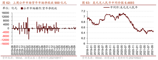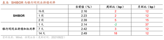 本周货币市场净投放900亿元,隔夜SHIBOR利率上行,1周/2周SHIBOR利率上行。截至9月22日,隔夜SHIBOR较上周上行2bps至2.16%,1周SHIBOR较上周上行2bps至2.23%,2周SHIBOR较上周上行5bps至2.39%。截至9月18日,1天银行间同业拆借利率较上周下行2bps至2.14%,7天银行间同业拆借利率较上周上行3bps至2.42%,14天银行间同业拆借利率上行18bps至2.48%。在货币市场方面,截至9月17日,上周货币市场投放1400亿元,货币市场回笼500亿元,货币市场净投放900亿元。在汇率方面,截至9月22日,美元兑人民币中间价报6.4693,较上周上行0.02。