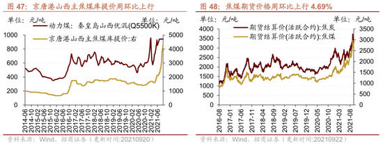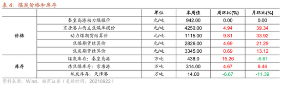 价格方面,秦皇岛港动力煤报价上周持平,京唐港山西主焦煤库提价周环比上行;焦炭、焦煤、动力煤期货结算价上行。截至9月20日,秦皇岛港动力煤报价942元/吨,与上周持平;截至9月18日,京唐港山西主焦煤库提价4250元/吨,周环比上行4.94%。截至9月22日,焦炭期货结算价收于3345.00元/吨,周环比上行0.69%;焦煤期货结算价收于2826.00元/吨,周环比上行4.69%;动力煤期货结算价1115.00元/吨,周环比上行9.81%。