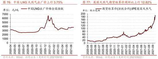 我国天然气出厂价上行,英国天然气期货结算价上行。截至9月18日,我国天然气出厂价报6112.0元/吨,较上周上行3.75%;截至9月21日,英国天然气期货结算价收于186.10便士/色姆,较上周上行12.82%。