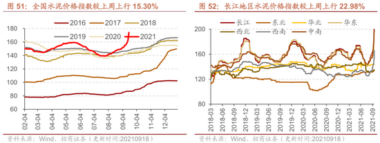 9月中旬以来,广西、江苏、云南、贵州等地限电趋严,市场供应趋紧,煤炭等成本价格上行,导致全国多数企业纷纷上调水泥价格。截至9月17日,焦炭价格月环比上行11.14%至3213.0元/吨;焦煤期货价格月环比上行21.17%至2687.0元/吨;动力煤价格月环比上行35.99%至1057.2%。成本提升导致近期多数地区纷纷上调水泥价格。根据中国水泥协会、数字网等信息显示,唐山地区熟料价格上调50元/吨,水泥价格即将跟进上调50元/吨,河北石家庄、邯郸、邢台等地区水泥价格推涨20-30元/吨,山西企业有计划在中秋后尝试推涨水泥价格,预计幅度50-80元/吨;晋城和长治地区水泥价格上调30元/吨;大连地区水泥价格上调30元/吨。