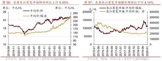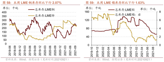 库存方面,截至9月21日,LME锡库存周环比下行1.63%至1205.0吨;LME铅库存本周下行0.09%至52675.0吨;LME锌库存本周下行3.15%至222475.0吨;LME铝库存较上周上行0.96%至1315975.0吨;LME铜库存较上周下行2.07%至231075.0吨;LME镍库存166788.0吨,较上周下行5.02%。