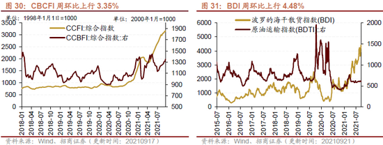 本周中国出口集装箱运价指数CCFI下行,中国沿海散货运价综合指数CCBFI上行。在国内航运方面,截至9月17日,中国出口集装箱运价综合指数CCFI周环比下跌0.02%至3156.86点;中国沿海散货运价综合指数CCBFI周环比上行3.35%至1353.09点。本周波罗的海干散货指数BDI上行,原油运输指数BDTI下行。在国际航运方面,截至9月21日,波罗的海干散货指数BDI为4410点,较上周上行4.48%;原油运输指数BDTI为607点,较上周下行1.14%。