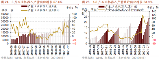 8月份工业机器人产量当月同比增幅扩大。8月工业机器人当月产量32828台/套,当月同比增长57.4%,增幅较7月增大15.1个百分点。2021年1-8月工业机器人累计产量为239249台/套,同比增长63.9%,增幅较2020年1-7月缩小0.7个百分点,累计产量较2019年同期增长98.09%。