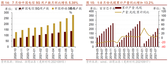 5G用户数持续上行。7月份中国电信5G用户数达到1.38亿户,月环比增长5.38%;中国移动5G用户数2.80亿户,月环比上涨11.53%。