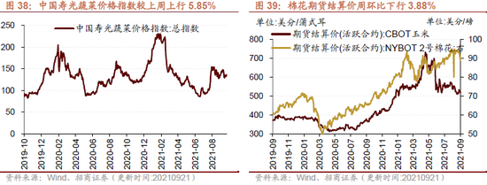 蔬菜价格指数上行,棉花、玉米期货结算价均下降。截至9月21日,中国寿光蔬菜价格指数为136.52,较上周上行5.85%;棉花期货结算价格为90.03美分/磅,较上周下行3.88%;玉米期货结算价格为517.00美分/蒲式耳,较上周下行0.62%。