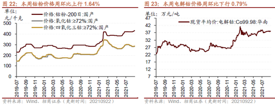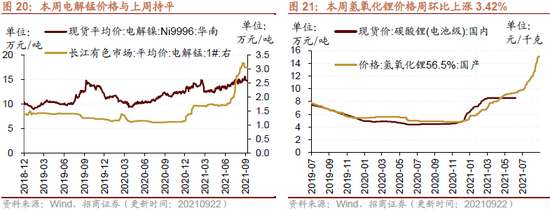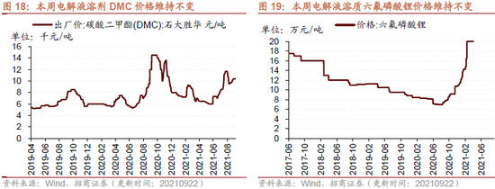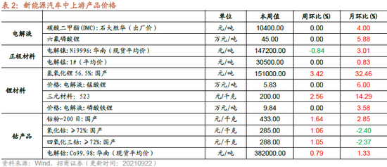 本周氢氧化锂、三元材料、碳酸锂等锂材料和钴粉、氧化钴等钴材料价格上行,DMC、六氟磷酸锂、电解锂等价格不变,电解镍价格下降。在电解液方面,截至9月22日,电解液溶剂DMC价格维持在10400.0元/吨;六氟磷酸锂价格价格维持在45.0万元/吨。在正极材料方面,截至9月22日,电解镍现货均价较上周下跌0.84%至147200元/吨;电解锰市场平均价格维持在30500元/吨。在锂原材料方面,截至9月22日,氢氧化锂价较上周上涨3.42%至151000.0元/吨,电解液锰酸锂价格维持在5.83万元/吨,三元材料较上周上涨2.56%至200.0元/千克,电解液磷酸铁锂价格维持在9.84万元/吨;钴产品中,截至9月22日,电解钴价格较上周上涨0.79%至382000.0元/吨,钴粉价格较上周上涨1.64%至433.0元/千克,氧化钴价格较上周上涨1.06%至285元/千克;四氧化三钴价格较上周上涨1.05%至288元/千克。