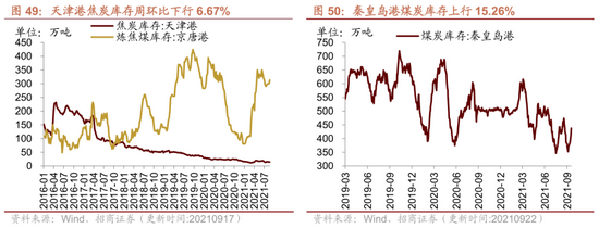 库存方面,本周秦皇岛港煤炭库存上行,天津港焦炭库存下行,京唐港炼焦煤库存上行。截至9月22日,秦皇岛港煤炭库存报438.0万吨,周环比上行15.26%;截至9月17日,京唐港炼焦煤库存报314.00万吨,周环比上行4.67%;天津港焦炭库存报14.00万吨,周环比下行6.67%。