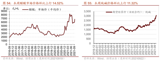 无机化工品期货价格多数上涨,醋酸与纯碱涨幅均超过10%。截至9月19日,醋酸市场均价6808.34元/吨,较上周上行14.52%;截至9月22日,纯碱期货结算价较上周上行11.32%至3059.0元/吨。截至9月18日,钛白粉市场均价至19580.0元/吨,较上周上行0.15%。