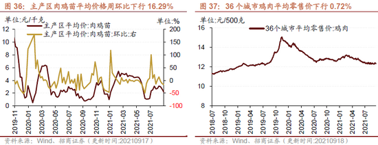 在肉鸡养殖方面,肉鸡苗、鸡肉价格下行。截至9月17日,主产区肉鸡苗平均价格为2.21元/羽,较上周下行16.29%;截至9月18日,36个城市平均鸡肉零售价格为12.33元/500克,较上周下行0.72%。