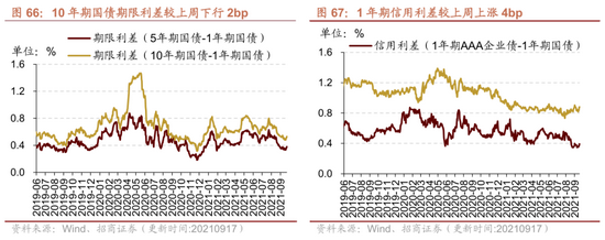 在债券收益率方面,6个月/1年/3年国债到期收益率上行。截至9月17日,6个月国债到期收益率本周上行6bp至2.29%;1年国债到期收益率上行4bp至2.39%,3年期国债到期收益率上行1bp至2.59%。5年期债券期限利差上行1bp至0.33%;10年期债券期限利差较上周下行2bp至0.48%;1年期AAA债券信用利差上行4bp至0.39%;10年期AAA级债券信用利差0.88%,周环比上涨3bp。