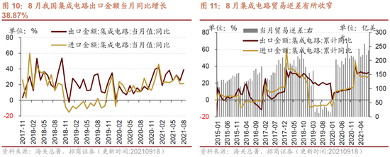 8月份集成电路当月进出口金额同比增速扩大,贸易逆差增幅收窄。根据海关总署统计数据,8月份当月我国集成电路进口额当月为378.96亿美元,同比增长21.48%,相比7月份增幅扩大0.47个百分点,累计同比增速为26.4%;8月份当月我国集成电路出口金额为143.05亿美元,同比增长38.87%,增幅扩大13.38个百分点,累计同比增速为32.4%;8月份我国集成电路当月贸易逆差为235.91亿美元,同比增长12.91%,增幅较7月份收窄5.53个百分点。