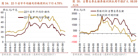 本周仔猪、生猪、猪肉价格下行。截至9月17日,22个省市仔猪平均价格27.69元/千克,周环比下行15.99%;22个省市平均生猪价格12.73元/千克,周环比下行7.28%;22个省市平均猪肉价格20.51元/千克,周环比下行4.78%。在生猪养殖利润方面,本周自繁自养生猪养殖利润和外购仔猪的养殖利润亏损幅度扩大。截至9月17日,自繁自养生猪养殖利润为-565.95元/头,较上周亏损扩大98.09元/头;外购仔猪养殖利润为-1138.92元/头,较上周亏损扩大45.70元/头。
