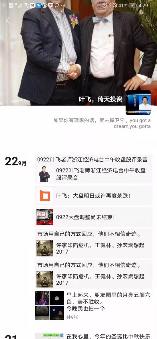 不过从叶飞个人微信朋友圈来看,截至今年9月22日,他的朋友圈还更新了多条信息,包括9月22日他曾参加了某电台的股评录音。
