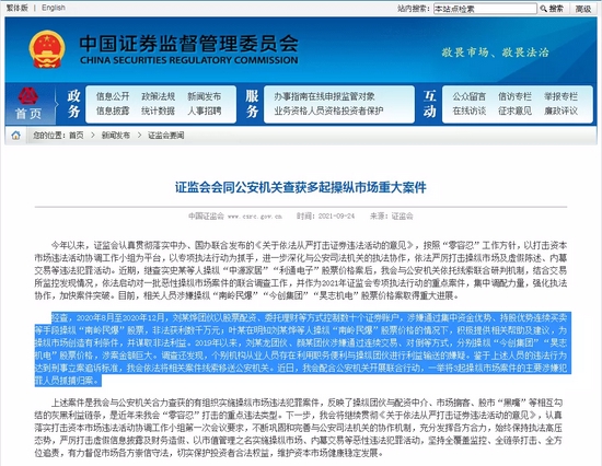 9月24日,证监会在会同公安机关查获多起操纵市场重大案件的通报中指出,下一步,将继续贯彻《关于依法从严打击证券违法活动的意见》,认真落实打击资本市场违法活动协调工作小组第一次会议要求,严厉打击虚假信息披露及财务造假、以市值管理之名实施操纵市场、内幕交易等恶性违法犯罪活动。