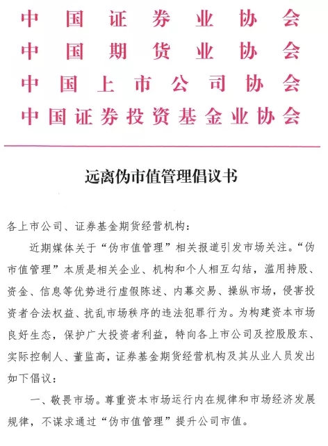 同时,9月24日,中国证券业协会、中国期货业协会、中国上市公司协会、中国证券投资基金业协会联合发布了《远离伪市值管理倡议书》,发出了九条倡议,包括:敬畏市场、敬畏法治、敬畏专业、敬畏投资者、加强文化建设、完善公司治理、强化职业道德和执业操守、强化基金管理人职责、珍惜行业、企业及个人声誉。