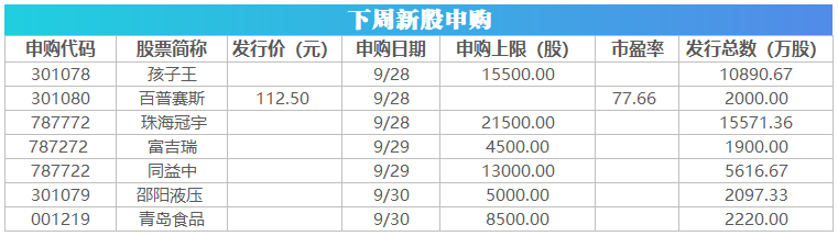 下周(9月27日至9月30日)将有7只新股发行,其中深市主板有7只,创业板有3只。9月28日发行的是珠海冠宇、百普赛斯、孩子王;9月29日发行的是同益中、富吉瑞;9月30日发行的是邵阳液压、青岛食品。这7只新股累计发行数量共计约4.03亿股,预计募集资金金额共计99.32亿元。