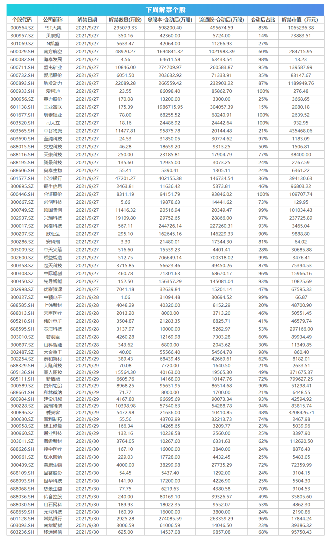 下周是国庆节前的最后一周,Wind数据显示,下周(9月27日至9月30日),沪深两市限售股上市数量共计57.8亿股,以9月24日收盘计算,市值不足千亿。其中,解禁体量较大的个股有*ST大集、南方航空、长沙银行、航发动力、丽人丽妆等。