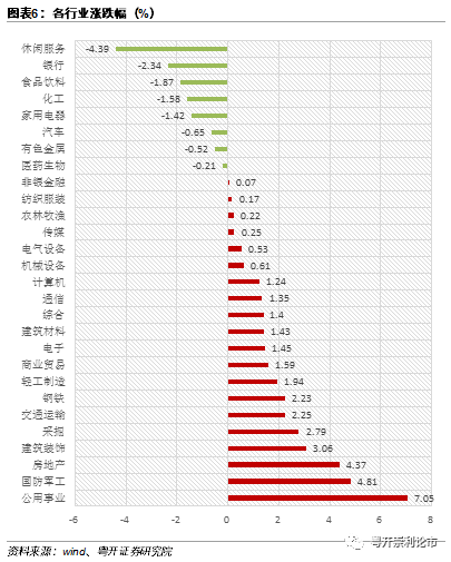 行业方面,本周申万一级行业涨多跌少,仅有8个行业下跌,公用事业和国防军工等板块表现亮眼。涨幅前五的行业分别是公用事业、国防军工、房地产、建筑装饰、采掘,跌幅居前的行业是家用电器、化工、食品饮料、银行、休闲服务。