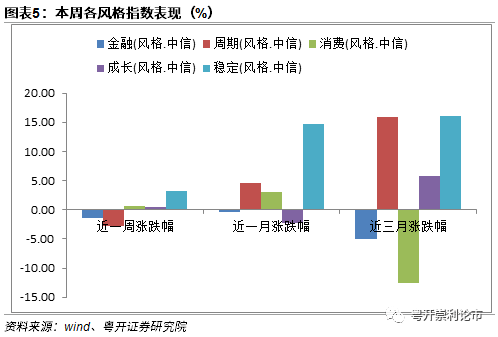 本周各风格指数中周期和金融风格下调,稳定风格指数大幅上涨。稳定风格本周大幅上涨3.20%,周期风格下跌2.83%,金融风格单周下跌1.35%。
