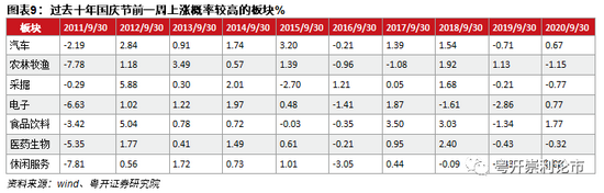 具体到行业来看,过去十年中国庆节前一周上涨概率较高的板块有汽车、农林牧渔、采掘、电子、食品饮料、医药生物、休闲服务、国防军工,上涨概率均超过60%,其中食品饮料和汽车板块过去十年国庆节前一周平均涨幅为0.97%和0.92%,主要由于国庆假期即将来临,为传统消费旺季,直接利好大消费板块。