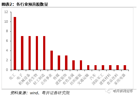 从行业分布来看,59家预喜股主要集中在化工、电子、机械设备、医药生物、轻工制造行业,共39家,占比66.10%。其中,化工行业11家,电子、机械设备、医药生物、轻工制造四大行业的预喜公司数量相同,均为7家。