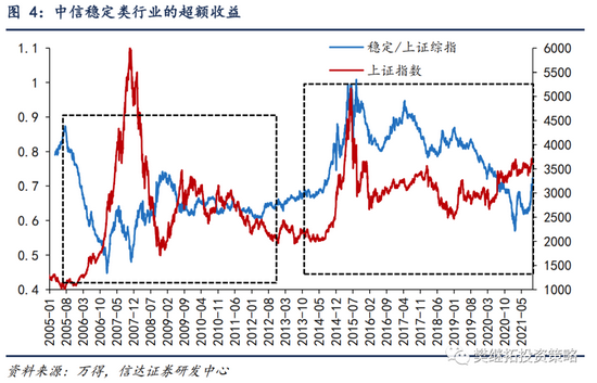 (3)公用事业类板块领涨对指数的影响。我们以中信稳定风格指数(包括电力、建筑、公路、铁路、港口、机场等)来概括公用事业类板块跟市场走势的关系。能够发现,2005-2013年,公用事业类板块大部分时候都是指数涨的指数跑输指数,指数跌的时候抗跌。2014年之后,更多以主题性机会出现。
