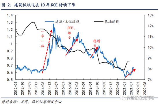 (2)景气度超预期正在阶段性让位于估值。虽然电力和建筑板块均有新能源和电力紧缺带来的ROE抬升的逻辑,不过按照2013年以来的经验,最终ROE的改善幅度大概率不会很大。一带一路、PPP、雄安等非常宏大的主题事后来看,主要是促成了板块的估值修复。