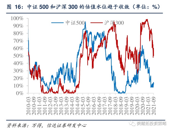 (2)从宏观环境来看,经济复苏进程受到疫情的扰动,市场对经济预期偏向悲观,虽然通胀在不断创新高,但主要是由于供给紧缩而非需求扩张,利率仍在下行期。这一时期市场风格往往会走向均衡。2016年以来大盘蓝筹风格已经持续了5年多的时间,截至2021年3月大盘股估值已经接近近5年最高点,与小盘股估值分化较为明显。同时在经济复苏后期,小盘股由于基数较低的原因业绩修复弹性更大,因此出现估值收敛。