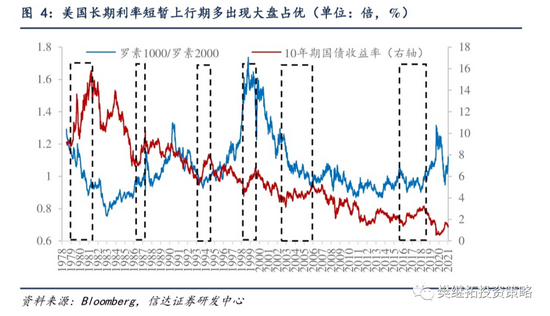 美股利率上行期有三次小盘股占优的特殊情况,主要发生在两种情况下:(1)新技术带来的科技产业高景气,小盘股存在增量机会。第一次是上世纪70年代中后期,当时美国经济深陷滞胀泥潭,利率不断走高。大盘蓝筹股估值业绩出现双杀。而这一时期在第三次科技革命的基础上,全世界范围内以微电子技术、生物工程、新型材料、宇航工程、海洋工程、核能技术等尖端技术的应用为主要标志的新技术革命再掀高潮,微软、苹果、甲骨文等知名科技公司均在这一时期创立。新兴经济的高景气成为市场追逐的方向,由此带来小盘股占优的行情。(2)危机事件冲击后,经济前景不确定性较强,由于基数较低且危机后流动性不会过分紧张,小盘股有更活跃的机会。比如2003-2006年,虽然美国经济复苏势头良好,但伊拉克战争的冲击使得国际形势比较动荡,股市中仍然是小盘股占优。2020年下半年,伴随着经济复苏长期利率出现上升,但由于新冠疫情对经济社会造成的冲击很大,小盘股也重新开始占优。