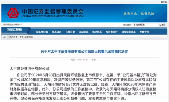 四川证监局10月11日披露了对太平洋证券的警示函措施,称太平洋证券于2021年5月28日出具天翔环境恢复上市保荐书,在第一节“公司基本情况”等处列示了公司2020年度净利润、净资产等财务数据,第二节“公司存在的主要风险以及原有风险消除情况的说明”提到,天翔环境财务会计文件无虚假记载。