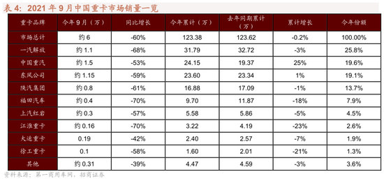 季度来看,三季度销量不到19万辆,同比下滑55%。1-9月累计销量增速出现由正转负的拐点。今年1-9月我国重卡市场累计销量约123.4万辆,同比下降0.2%,相比1-8月的8.1%增幅缩窄了8.3个百分点。在经过连续五个月的不断“缩窄”后,重卡市场累计销量首次出现同比下降。