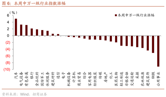 风格的角度来看,行业风格分化较为明显,可选消费、必选消费风格上涨,其余风格均下跌,从大小盘风格方面,本周显著偏中大市值风格。申万一级行业整体跌多涨少,汽车、电气设备、有色金属涨幅居前,跌幅居前的行业分别有公用事业、钢铁、建筑装饰,从涨跌原因来看。本周市场开始预期汽车缺芯问题逐步解决,汽车产销可能因此修复,带动汽车板块大涨,此外,国家主席习近平本周以视频方式出席《生物多样性公约》第十五次缔约方大会领导人峰会并发表主旨讲话,表示中国将加快建设大型风光基地项目,带动了光伏等板块上涨;而有色金属板块由于此前下跌幅度较大,本周也迎来了反弹。其余上涨居前的行业中,银行板块、食品饮料板块主要由于年底避险资金涌入。下跌居前的行业中,公用事业板块主要由于电力板块的下跌带动,近期电价改革落地,预期兑现。