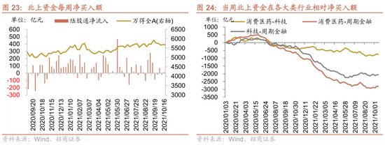 本周(10月10日-10月14日)北上资金净流入15.0亿元,相比前期上升。行业偏好上,北上资金净买入规模较高的为银行、电气设备、电子等,分别净买入23.1亿元、22.1亿元、15.3亿元;集中卖出医药生物、非银金融、房地产等,净卖出规模达21.6亿元、19.8亿元、10.6亿元。如果从大类行业来看,本周北上资金各大类板块的相对净买入额排序为科技>周期金融>消费医药。
