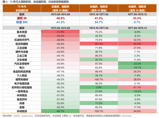 回答4:短期有风险偏好的压制,但是中期并没有显著关系,可以视为独立事件。如果仅是美林时钟里的滞胀阶段,一般持续时间比较久,且随后进入衰退阶段也会开始有宽松的预期,对风险偏好有正面作用(我们判断当前更类似于这种情形)。退一步说,即使是如同美国70年代的大滞胀时期,表现抗跌的行业也都是高景气行业,比如受益于战争催化(航空、国防),以及油价上涨的行业(基本资源、化学品、石油和天然气),还有随后在75-79年新兴产业爆发(集成电路、微型计算机等)带来的中小股票占优。在滞胀或类滞胀环境中,高景气度才是抵抗风险的关键。