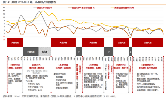 回答7:首先,从中证500的股债收益差来看,目前仍处在-1X到-2X标准差之间,相对沪深300股债收益差的位置来说,优势仍在。其次,指数或风格之间的相对走势由相对业绩的强弱决定,复盘美股50年的四次持续的小盘风格,主要有两个成因:一是动荡年代的危机冲击之后,小盘股由于低基数带来次年高增长,业绩相对占优,如08-09年次贷危机、20-21年新冠疫情;二是新兴产业革命的出现,中小盘行情主导,如70年代中后期的计算机。今年的A股同时叠加了中小盘低基数效应以及新兴产业的出现,支撑风险阶段性偏向中小盘。展望2022年,由低基数困境反转带来的中小盘占优可能初步消退,但是产业爆发的高景气赛道中,中小盘的业绩和风格可能继续占优。