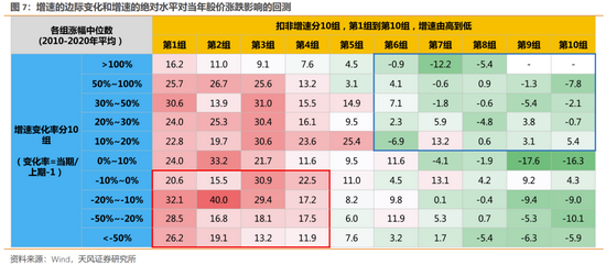 下图中,我们对此进行了详细的数据回测:扣非增速前1-3组,不管增速变化率如何,上升或下降,其股价收益率基本都能稳定在较高水平。即如果增速较去年下降,但今年仍然是全部A股中增速较快的,那么其股价表现仍然不错,比如增速从50%下降至 40%,变化率-20%,但其市场表现依然可以较好。【图中红色方框】