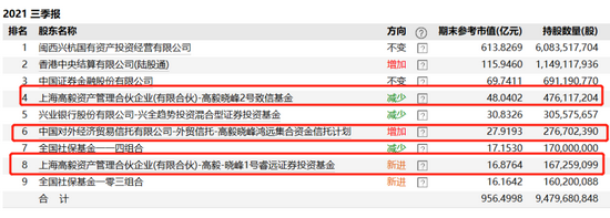 此外,曾在2021年一季报短暂现身前十大流通股股东的高毅晓峰1号睿远基金,在今年三季报中又重新出现,不过相比一季报持有的1.76亿股股份,目前高毅晓峰1号睿远基金的持股数有人有所减少,持有1.67亿股。