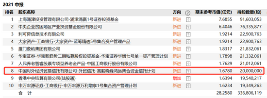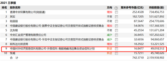 数据显示,邓晓峰管理的外贸信托-高毅晓峰鸿远集合资金信托计划新进该股前十大,持有4901.85万股,期末持股市值达到16.85亿元,位列第九大流通股东的位置。(见下图)
