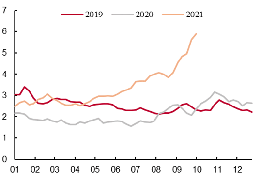 能源及部分大宗商品的上涨惯性依然存在,11月份PPI或许还将创新高,但这应该不是一轮超级周期。因此,随着明年全球产业链、供应链的逐步恢复正常,随着传统能源行业资本开支的增加,随着资源国供给规模的扩大,能源价格大概率会逐步回落,我认为最晚在明年下半年出现普遍回落。如果能源价格的回落,对中国这个制造业大国而言,经济上应该是利好。当然,它也会改变上中下游的收入结构。