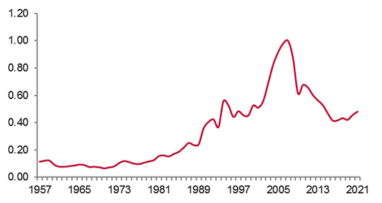 因此,期望基建投资增速大幅提升来弥补房地产投资增速下降的缺口并不现实。房地产行业对中国经济举足轻重,相信2022年在政策上一定会多管齐下,防止房价大起大落。从有利的方面看,有日美房地产泡沫破灭的前车之鉴,我国早就采取了应对房地产风险的多种举措,而且目前的利率水平也处在历史低位,房价调控能力较强。从不利的方面看,我国经济对房地产的依赖度较高,如房地产投资占固定资产投资总额的30%,即便房价不出现大幅波动,投资增速的下降则是必然的。